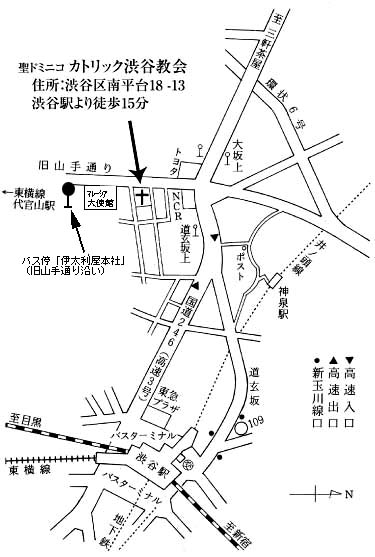 渋谷カトリック教会(団本部)案内図 ※団本部は地下1階にあります。 ※渋谷駅から徒歩15分 ※バス:渋谷駅南口35番乗り場(歩道橋の袂)からトランゼ(赤いミニバス)乗車 バス停「伊太利屋本社」(4つめ)下車徒歩2分 ※駐車場もありますが、土日はミサなどの為満車の場合が多いです