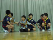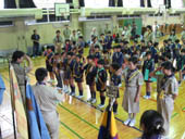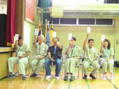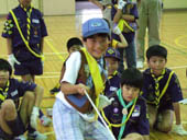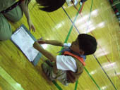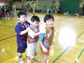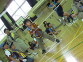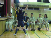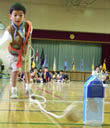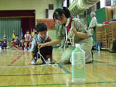 | チーム分け発表 | 第1競技:よ〜く狙ってペットボトルを倒せ! | |